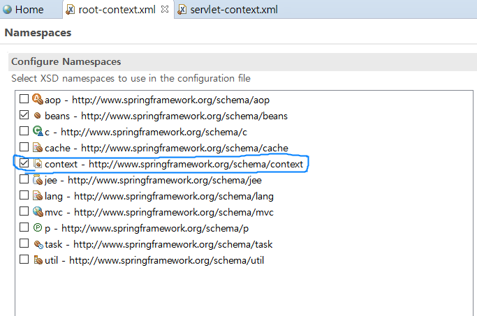 root-context.xml파일을 열어서 Namespaces항목에 들어간다.