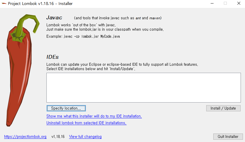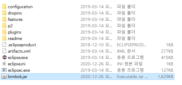 설치가 끝나면 아래 사진과 같이 이클립스 경로에 lombok.jar 파일이 추가된 것을 볼 수 있다.
