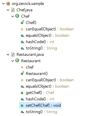 간단히 Chef와 Restaurant 클래스를 생성했다. Restaurant클래스는 chef를 필드로 한다.