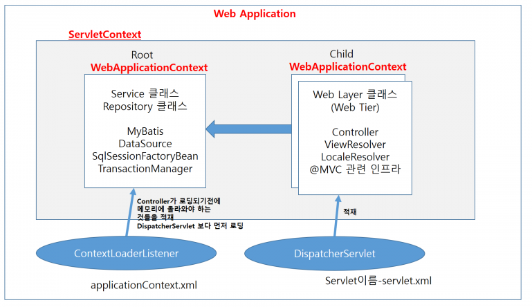 또 아래 그림과 같이 ContextLoaderListener는 DAO, @Repository, @Service, @Entity와 같은 클래스들을 적재하고,