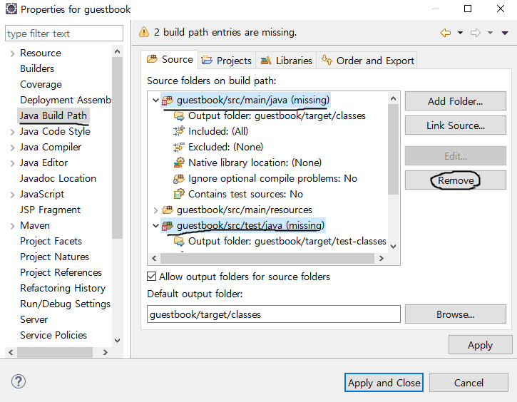 2. 아래 사진처럼 두 가지 항목 삭제 후 Apply and Close